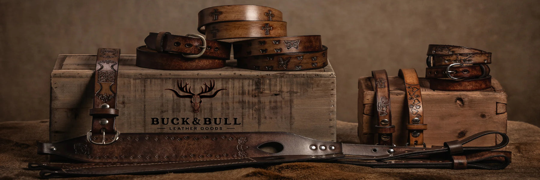 All Buck and Bull leather belts and gun slings are custom made from our highest quality leather and crafted 100% in the Southern United States. We've dedicated years to our leather craft and take a lot of pride in our work. Each item is custom made with no two products being exactly the same. Our leather belts are available in sizes for men, women and youth and our gun slings have a full lifetime warranty. All leather goods can be personalized and make great gift items, sure to become priceless family heirlooms. Our quality can't be beat at a price point you will love!